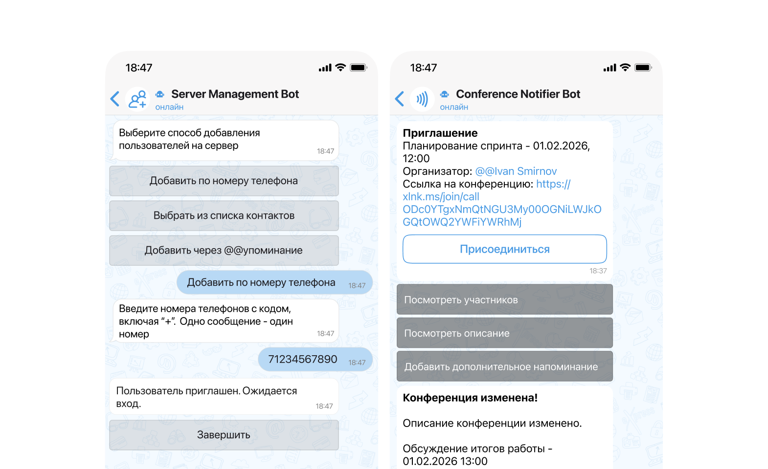 Удаление и добавление пользователей происходит с помощью специального чат-бота, доступного администратору системы.