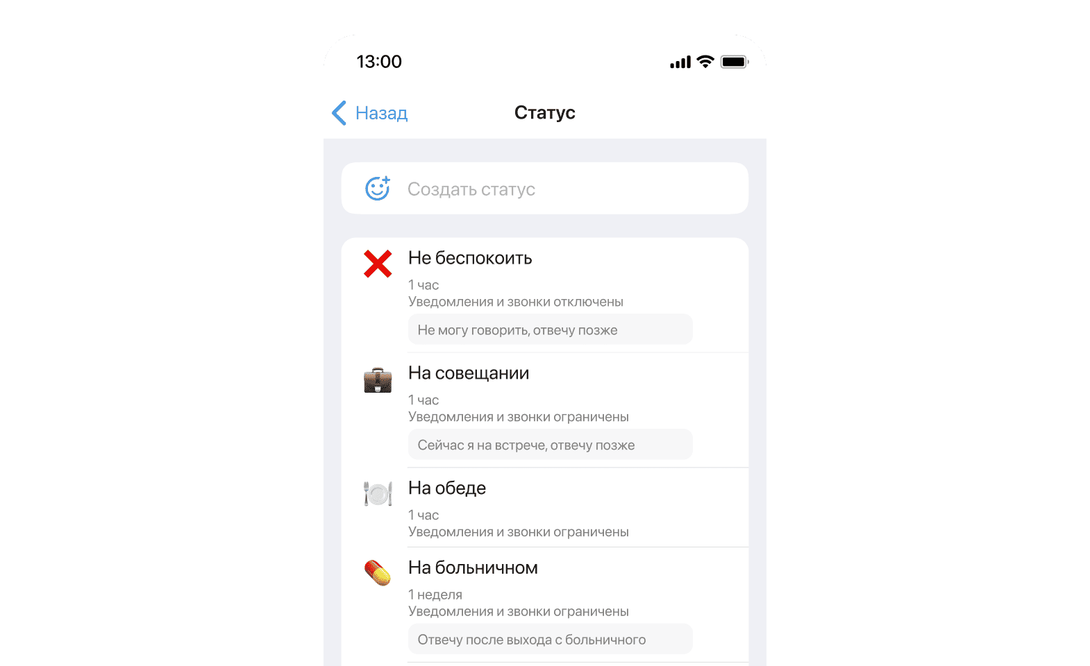 - A set of ready-made statuses (Do not disturb, At lunch, etc.)